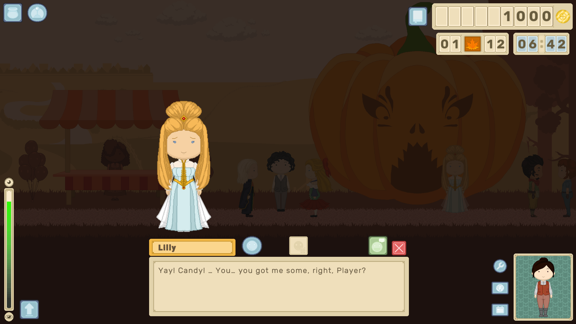 Finally, the Day of Reflection festival! This Fall festival is supposed to be used to appreciate one’s place in life and its gifts, but now residents mostly use it as an excuse to give each other pumpkin-themed candy. Pumpkins are imported from Lottapeak, much like the festival itself. Get a special boost to friendship if you give out candy sold by nearby vendors.